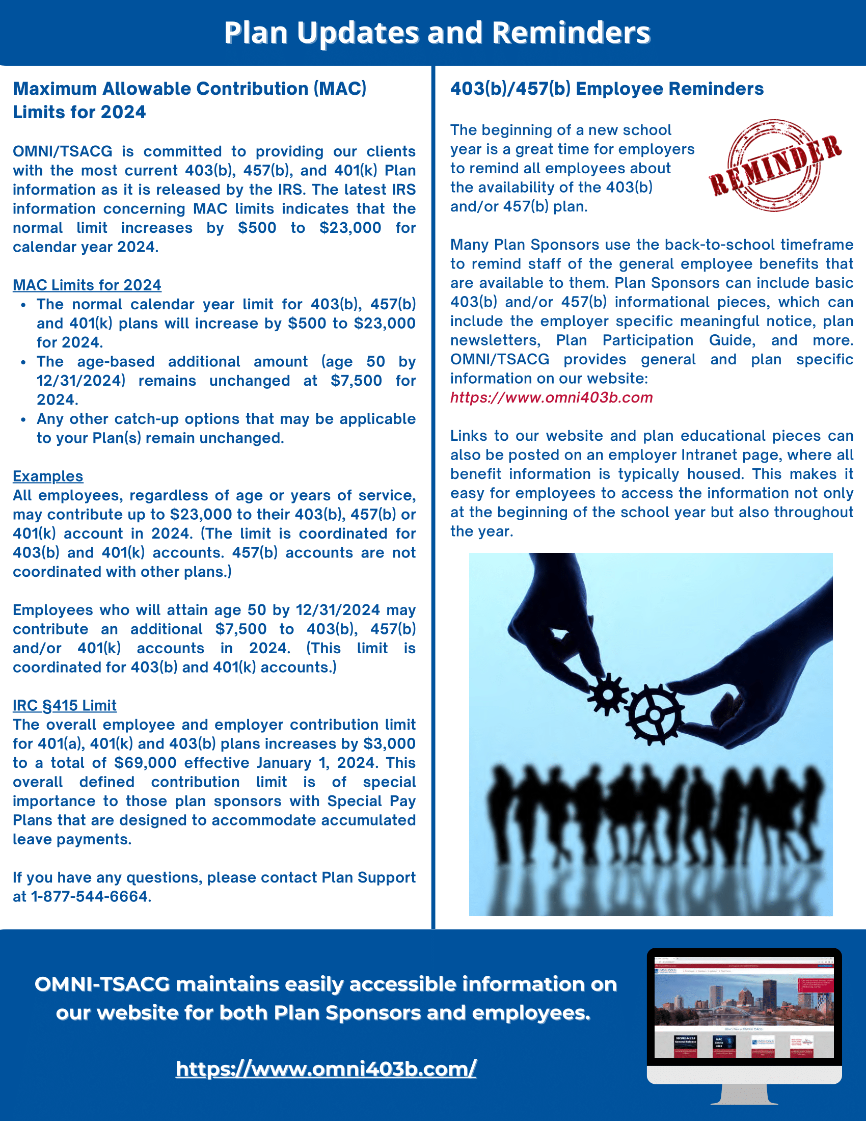 A 403(b) plan is a tax-deferred retirement savings plan offered to public school employees through their school districts or open-enrollment charter schools. Like 401(k) plans in the private sector, employees can make contributions to 403(b) plans on a pre-tax basis. Employers direct these contributions to specific 403(b) investment products selected by each employee from among the options available in their district or charter school. Get more information or contact Omni to enroll.